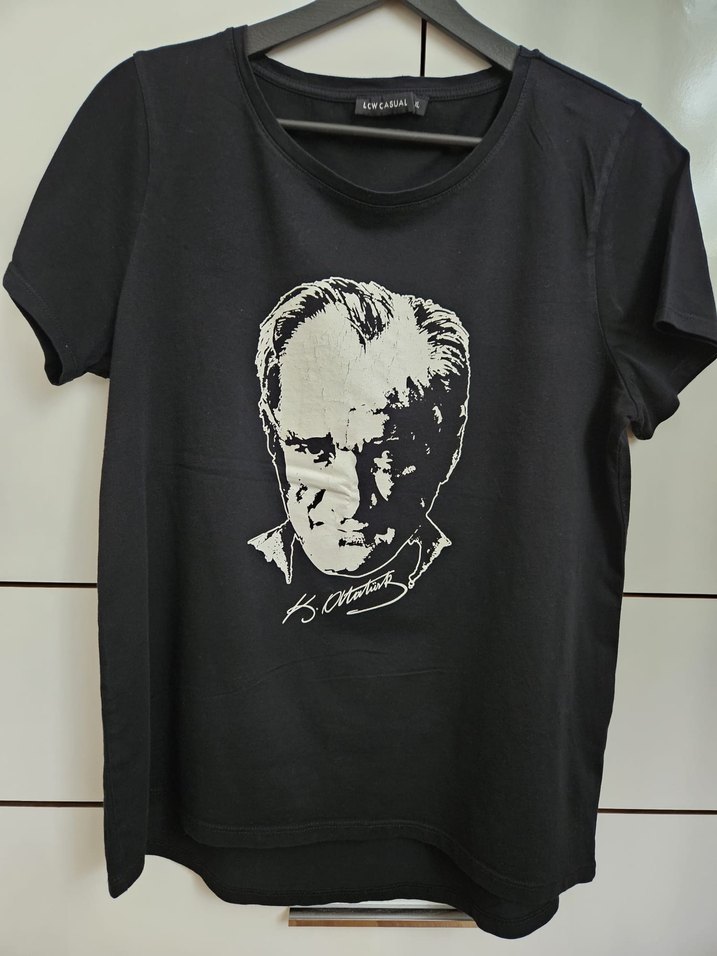 Pamuklu, siyah- beyaz renk, kısa kollu, yuvarlak yaka ve normal kesim kadın tişörtü. Önünde Atatürk baskılı grafik bulunur.