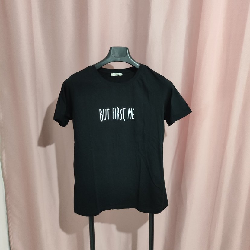 Siyah pamuk kumaştan, kısa kollu, bol kesim ve bisiklet yaka tişört. "BUTFIRSTME" baskılı, rock punk tarzını yansıtıyor.