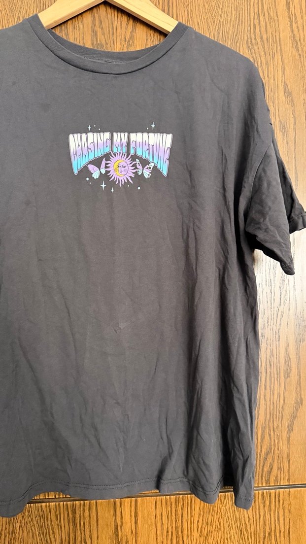 Siyah pamuklu kısa kollu, yuvarlak yakalı, renkli baskılı ve düğmeli detaylı kadın tişörtü. Salaş kesim ve normal boyda, parti için uygun.