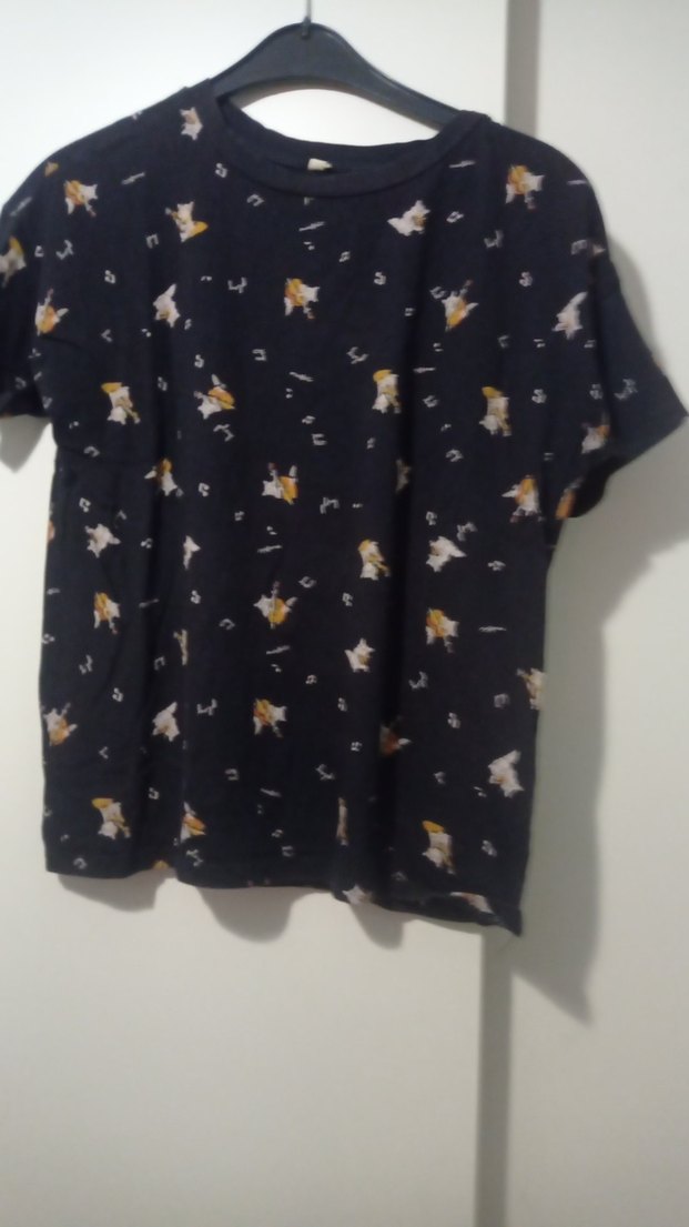 Siyah baskılı, kısa kollu, bol kesim ve bisiklet yaka kadın tişörtü. Sentetik kumaştan, günlük kullanıma uygun rahat bir sokak stili sunar.
