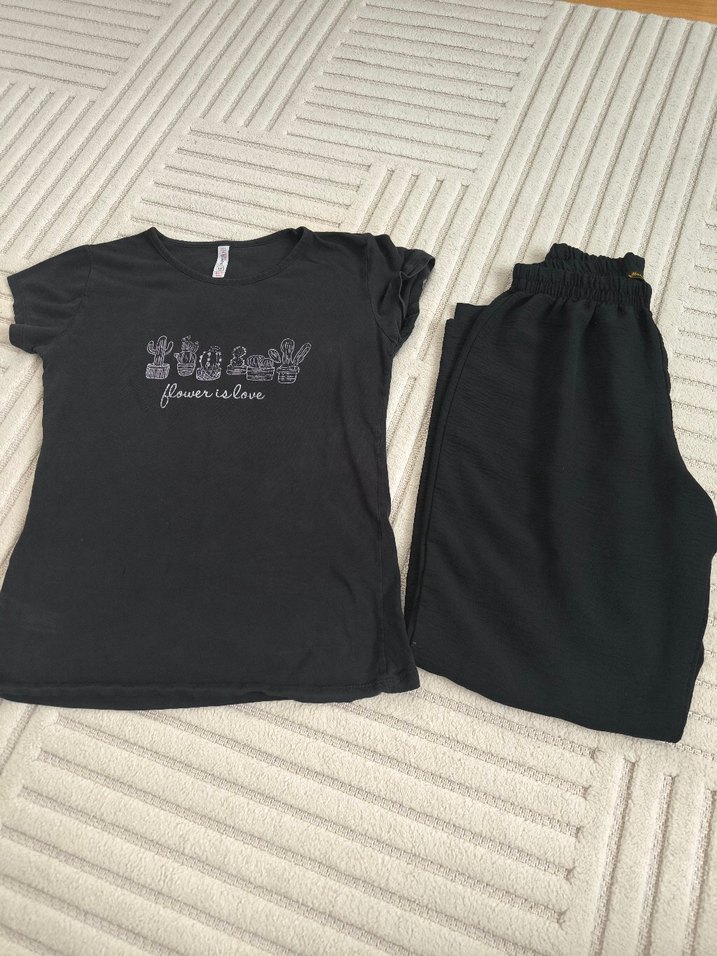 Siyah Baskılı Kadın tişört ile pijama M beden