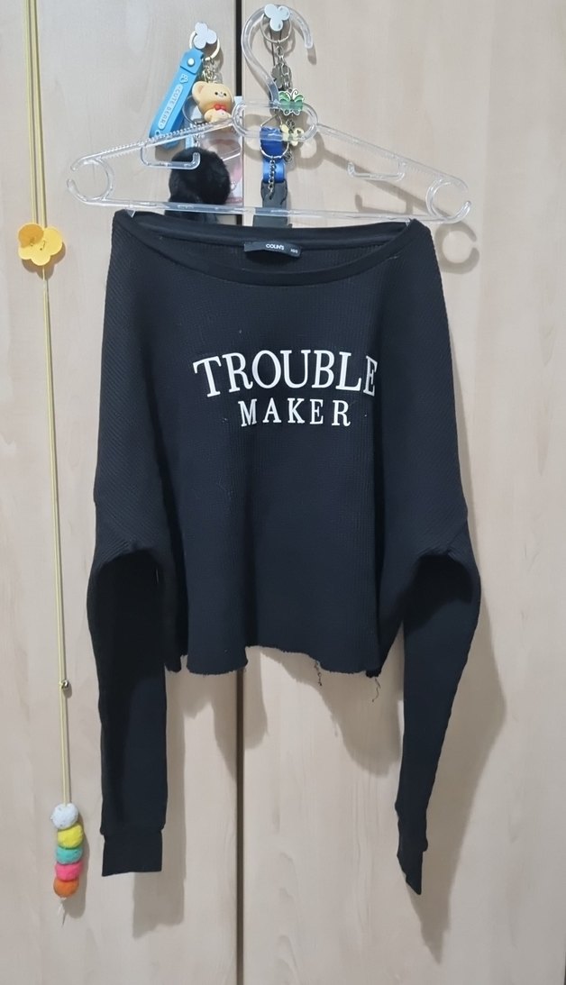 Siyah renkli, uzun kollu, yuvarlak yakalı ve bol kesim kadın triko sweatshirt. Önde "TROUBLE MAKER" baskısı bulunur, yumuşak sentetik kumaştan üretilmiştir.