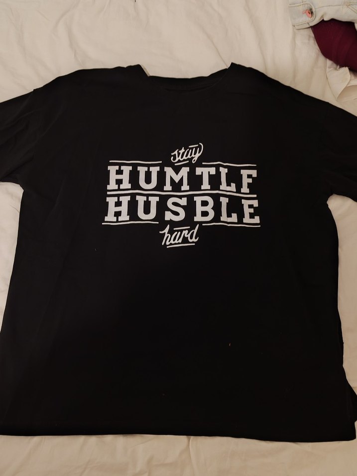 Siyah i, kısa kollu, bol kesim ve bisiklet yaka tişört. Üzerinde baskılı motivasyonel yazı ve tokalı detay bulunur. Trend sokak stili için uygundur.