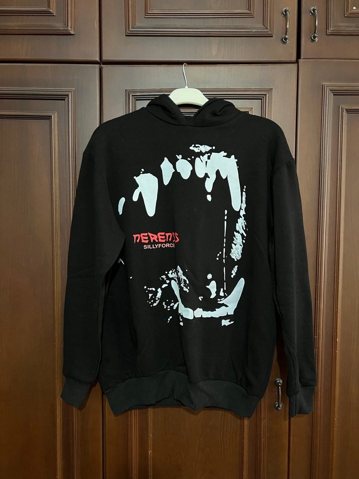siyah sweatshirt, kapüşonlu, uzun kollu ve baskılı. Rahat kesimli, yumuşak ve sıcak kumaştan yapılmış. Günlük kullanım için uygundur. Ürünü bir kez giyip yıkadım. Hiçbir hasarı yoktur.