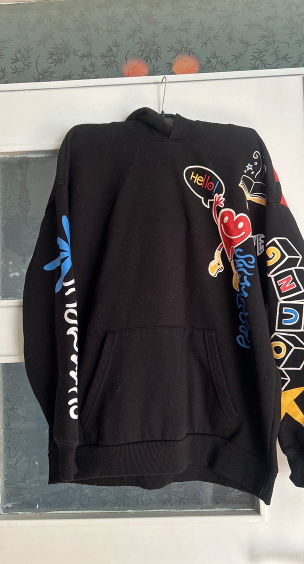 Siyah, baskılı, kapüşonlu, bol kesim sweatshirt. Uzun kollu, bisiklet yaka ve fermuarlı cepli, yumuşak ve sıcak kumaştan yapılmıştır.