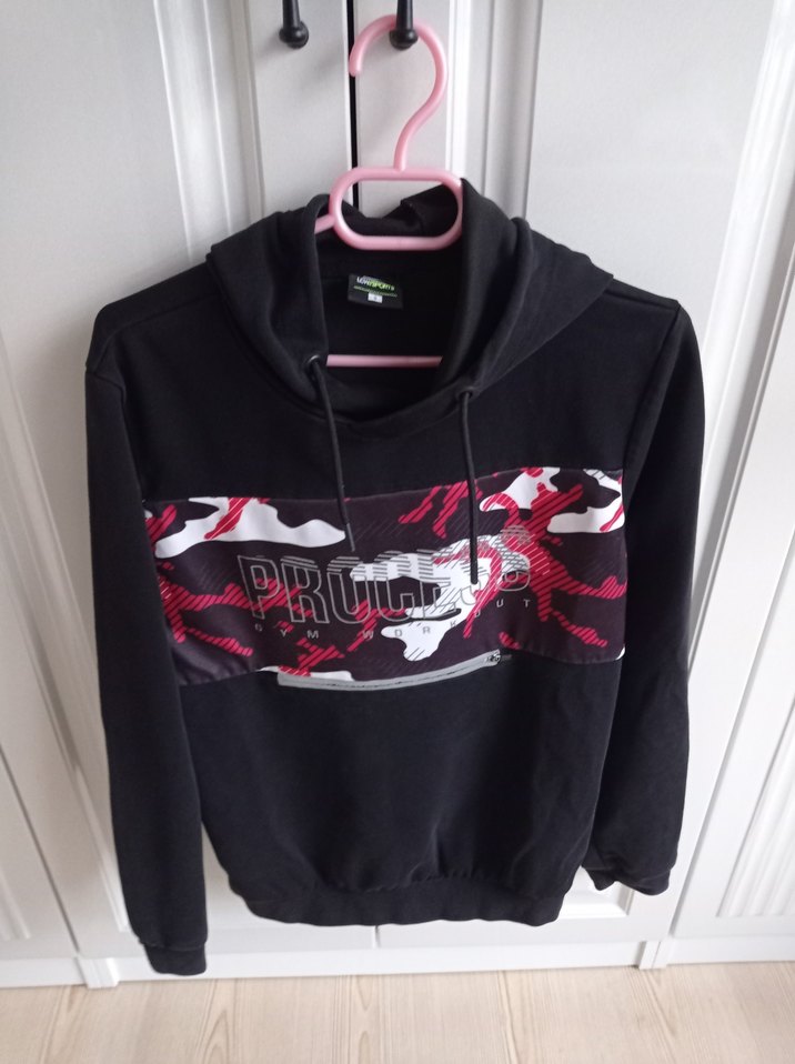 Siyah renkli, baskılı, kapüşonlu sweatshirt. Uzun kollu, bol kesim ve bisiklet yaka. Yumuşak, sıcak kumaştan, fermuarlı cepli.ön tarafında cep detayı var temiz kullanılmıştır