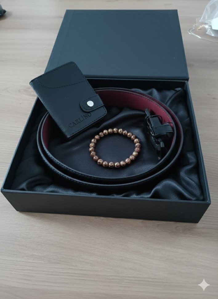 Siyah baskılı kemer, çıtçıtlı cüzdan ve boncuklu bileklikten oluşan set, şık kutuda sunulur. Kemer modern tarzda ve koyu renklidir.