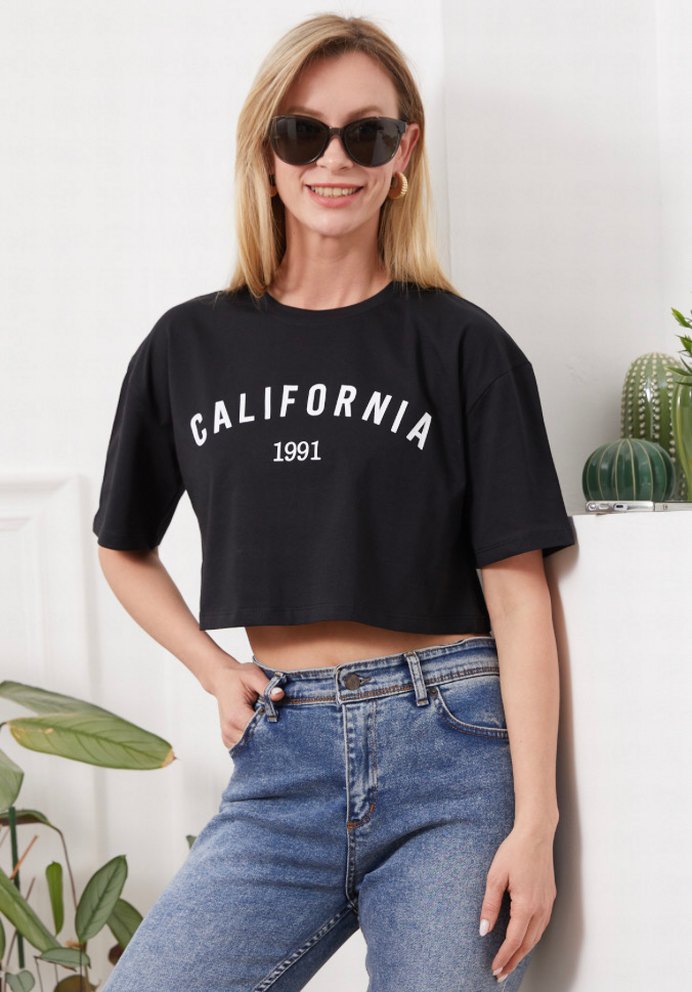 Siyah Baskılı Kısa Denim Tişört