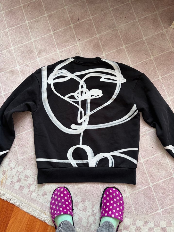 Siyah, uzun kollu ve yuvarlak yakalı, bol kesim kısa sweatshirt. Ön kısmında soyut baskı deseni bulunur, yumuşak ve sıcak kumaştan üretilmiştir.