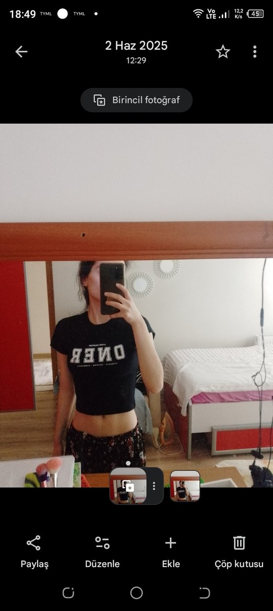 Dar kesim siyah baskılı crop top, kısa kollu ve bisiklet yaka. Denim kumaştan, rock punk ve sokak modası tarzını yansıtır.