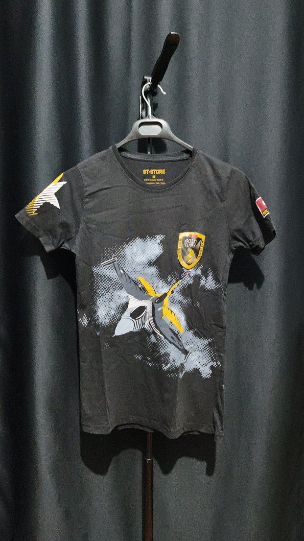Sentetik kumaştan üretilmiş, baskılı ve tokalı detaylara sahip, kısa kollu, bisiklet yakalı, siyah erkek tişörtü. Sokak stili ve spor için uygun, dar kesim.