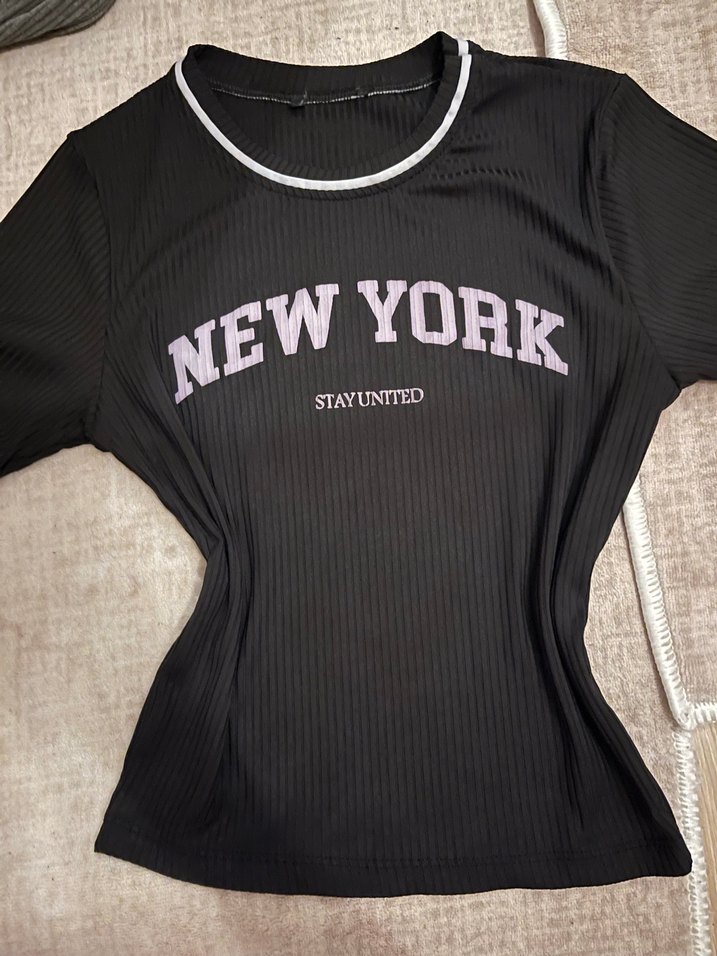 Kısa kollu, bisiklet yaka, siyah renkli, baskılı 'NEW YORK' ve 'STAY UNITED' yazılı, esnek kumaş