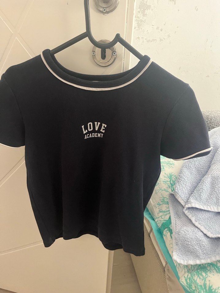 Pamuklu, siyah, kısa kollu, baskılı 'LOVE ACADEMY' yazılı, dar kesim tişört, sokak stiline uygun.