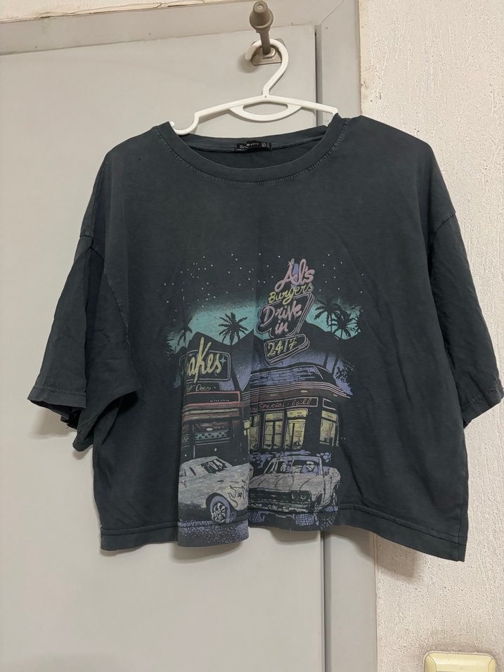 Pamuklu, siyah renkli, baskılı vintage sokak tasarımlı, kısa kollu, bol kesim mini kadın tişörtü. Yuvarlak yakalı, günlük kullanıma uygun.