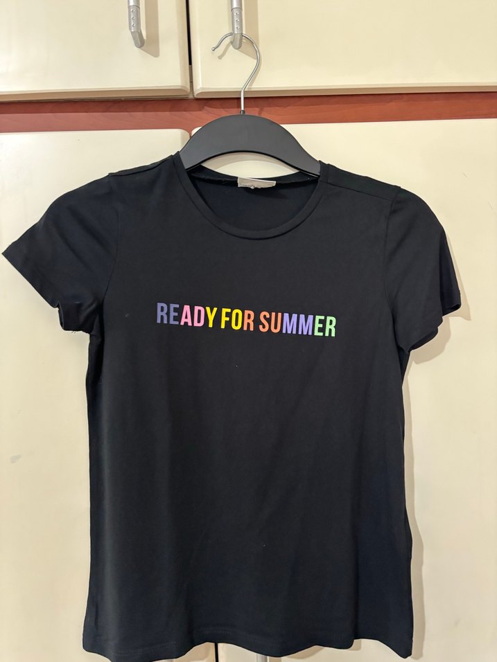 Siyah, kısa kollu ve bisiklet yaka kadın tişörtü, önünde renkli "READY FOR SUMMER" baskısıyla sokak stiline uygun rahat bir modeldir.
