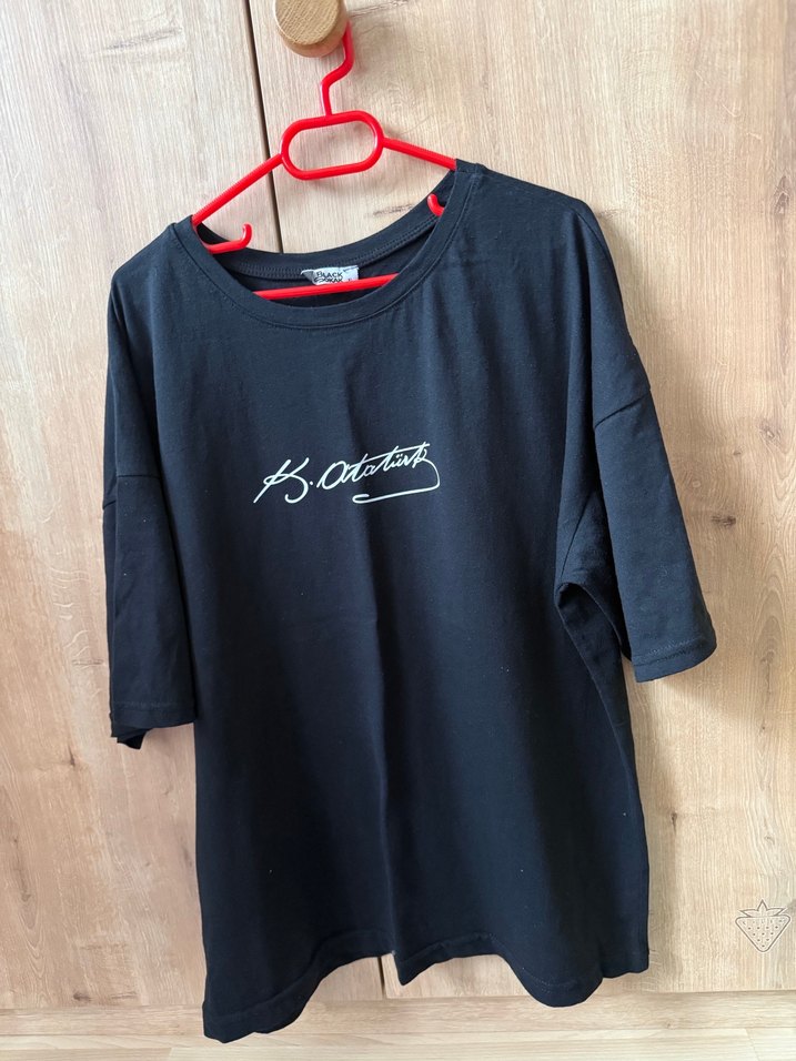 Siyah pamuk kısa kollu, oversize kesim ve yuvarlak yaka tişört. Baskılı deseniyle gündelik sokak stiline uygun rahat ve şık bir parça. Aslında hiç giyilmedi. Etiketi yok.