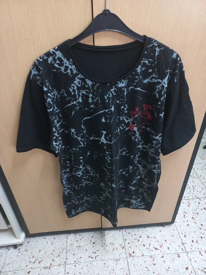 Siyah baskılı, kısa kollu, salaş kesim kadın tişörtü. Sentetik kumaştan, yuvarlak yakalı, grunge punk tarzında gündelik kullanım için uygun. Eni 57 cm Boyu 74 cm dir.