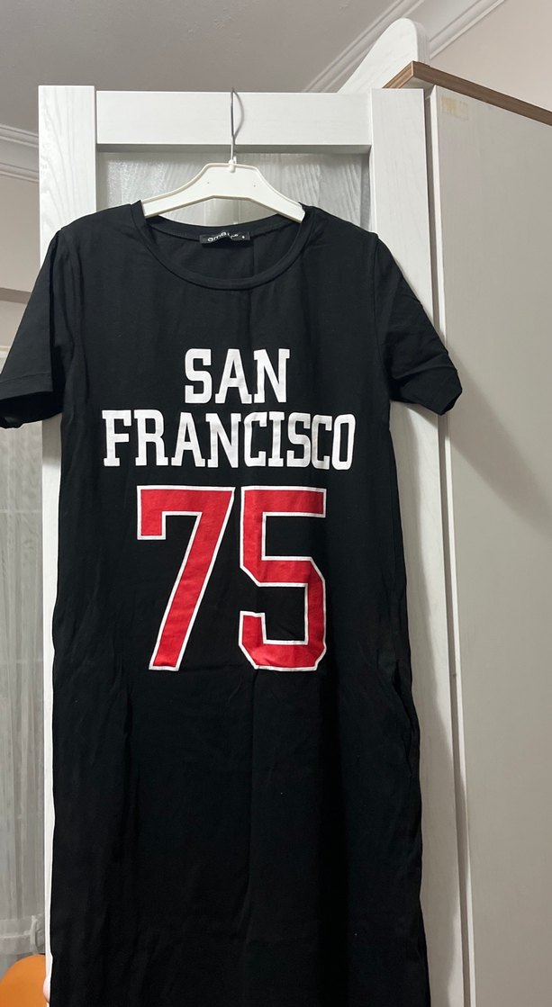 Siyah, kısa kollu ve dar kesim midi boy elbise. Sentetik kumaştan, yuvarlak yakalı ve üzerinde '75' ve 'San Francisco' baskısı bulunur.