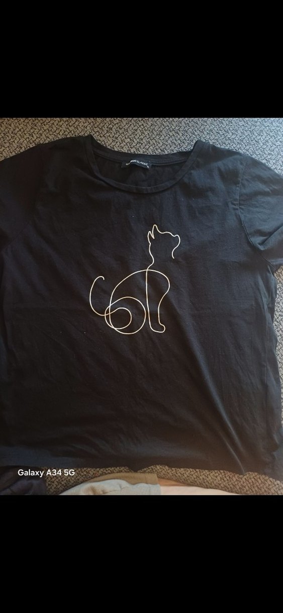 Siyah, kısa kollu tişört , yuvarlak yaka ve minimal baskılı kedi deseniyle. İpeksi kumaştan, rahat ve bol kesim, günlük kullanıma uygun. ✨