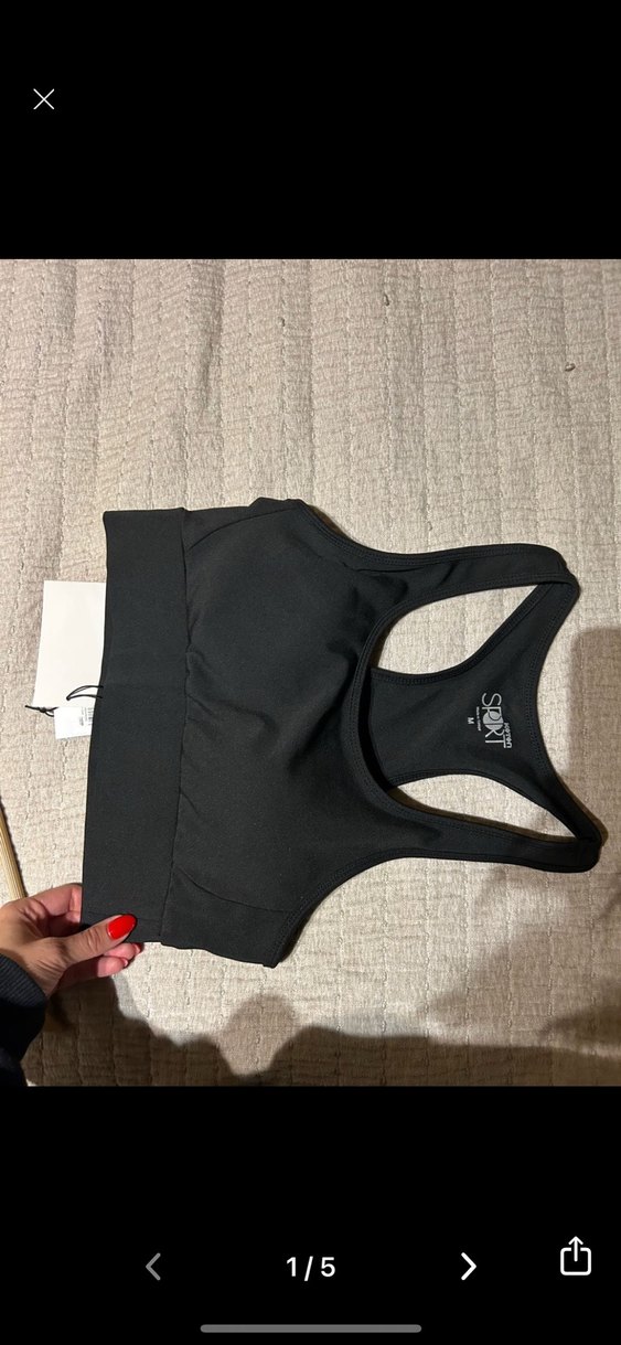 Siyah baskılı, kısa kesim ve sırtı racerback tasarımlı spor sütyeni. Rahatlık ve destek sunar, sokak modasına uygundur.