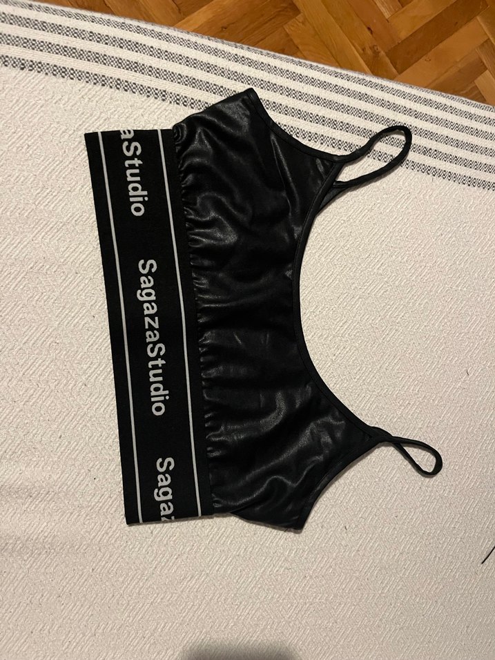TRENDYOLx SAGAZA STUDİO Baskılı 'SagazaStudio' yazılı bantlı siyah kısa spor sütyeni, ince ayarlanabilir askılarla sokak stili ve rahatlığı birleştirir.
