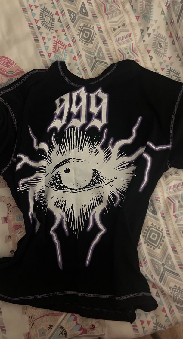 Siyah, kısa kollu, bol kesim kız tişörtü, baskılı göz ve 999 deseniyle, sentetik kumaştan üretilmiştir. Rock punk tarzına uygun.