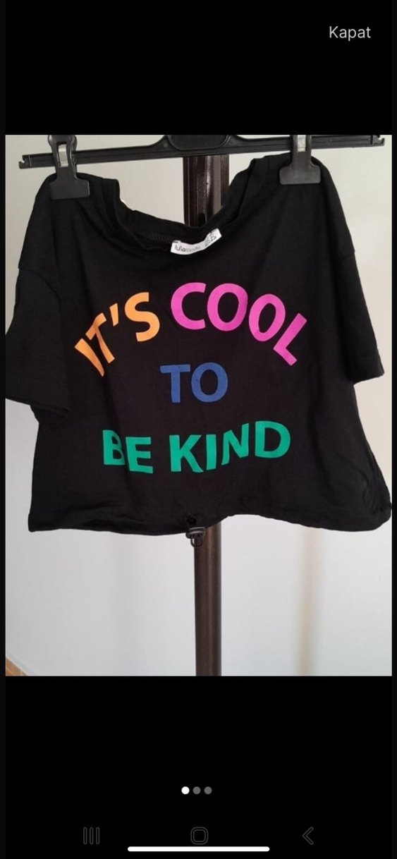 Pamuk siyah tişört, kısa kollu ve bol kesim. Üzerinde 'IT'S COOL TO BE KIND' renkli baskı bulunur, sokak stili için uygun.