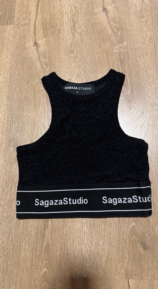 Siyah, kolsuz ve dar kesim crop top. Elastik, baskılı kumaştan yapılmış, alt kısmında 'SagazaStudio' yazılı bant bulunur. Spor ve sokak tarzına uygun.