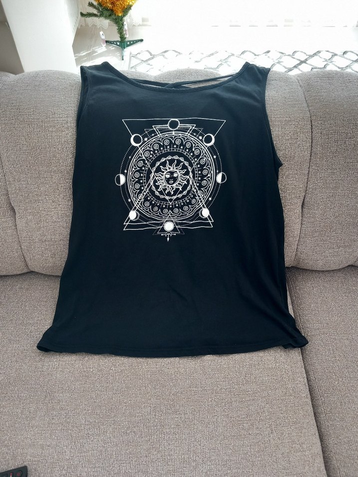 Siyah baskılı kolsuz hamile üstü, goth tarzı desenlidir. Yuvarlak yaka ve bol kesimdir, yumuşak sentetik kumaştan yapılmıştır.