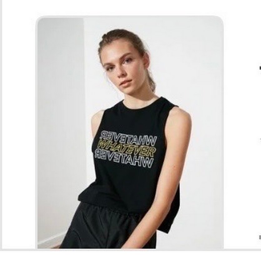 Siyah renkli, kolsuz ve bol kesim spor üst, yuvarlak yaka ve 'WHATEVER' baskılı desene sahip, şık ve rahat bir tasarım.