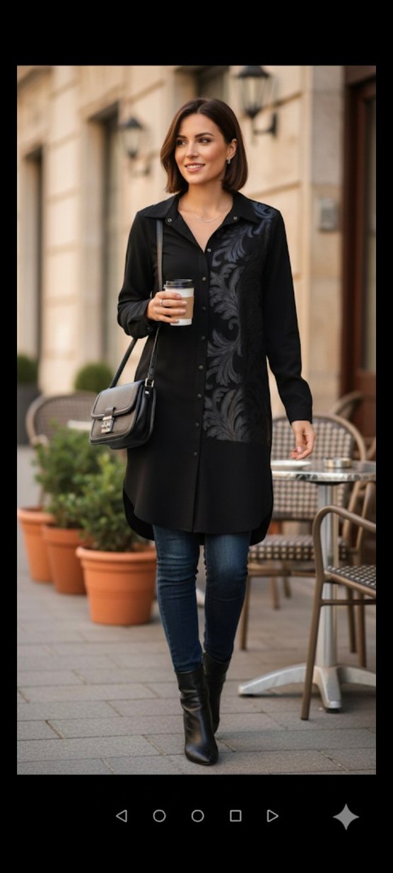 Siyah kot kumaştan, uzun kollu, düğmeli ve baskılı desenli bol kesim tunik. Notlu yaka detayıyla günlük sokak stiline uygun.