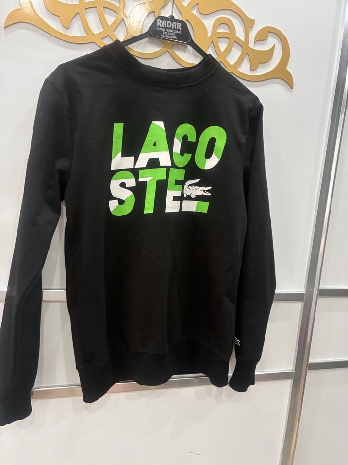 Siyah baskılı Lacoste sweatshirt, yuvarlak yaka ve uzun kolludur. Sentetik kumaştan üretilmiş, bol kesim ve kısa boydur. Spor ve günlük kullanıma uygundur.
