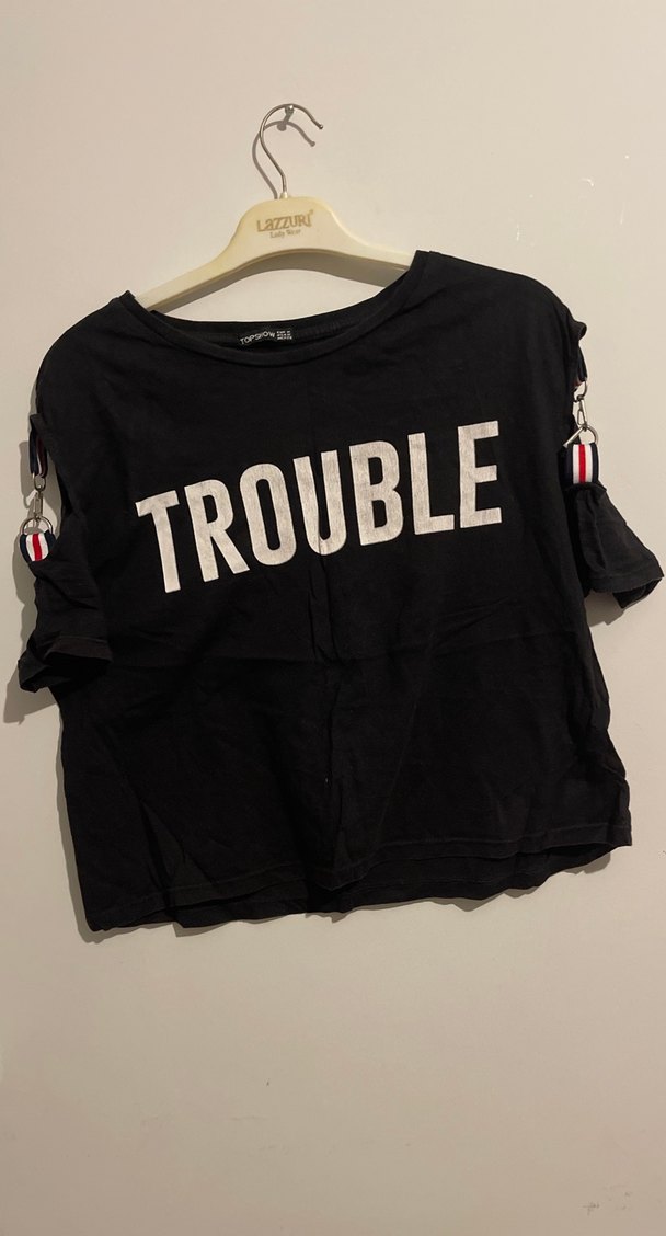 Siyah, loose fit kısa kollu tişört, bisiklet yaka ve tokalı kollara sahip. Büyük 'TROUBLE' baskısı ve rahat sokak stiliyle dikkat çekiyor.