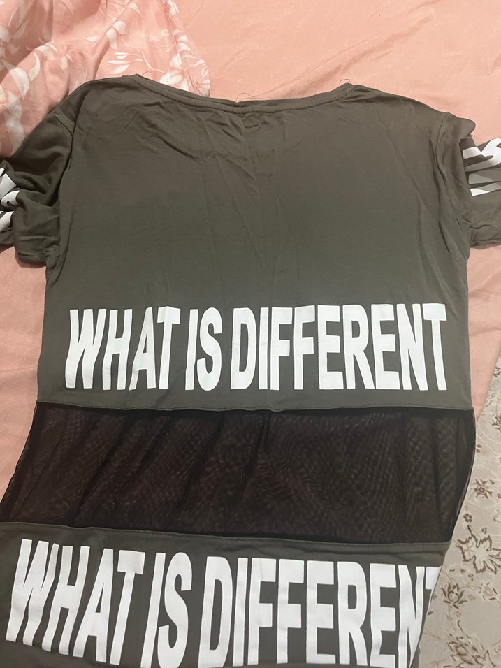 Koyu yeşil, bol kesim tişörtü, kısa kollu, bisiklet yaka, baskılı yazılı ve kuşaklı detaylı. Sentetik kumaştan midi boy ve file panel içerir.