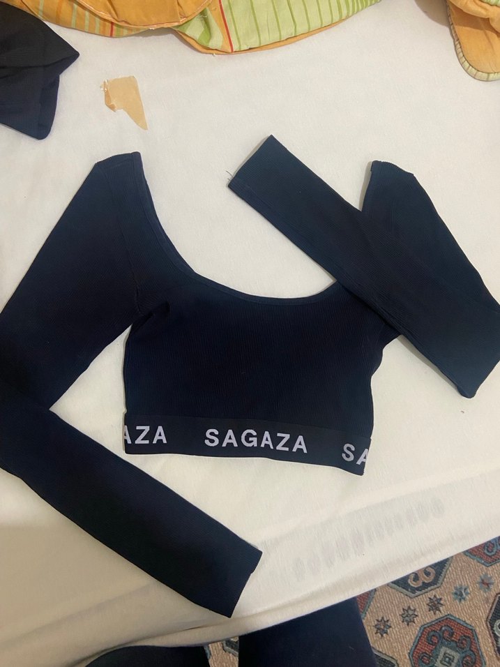 Siyah baskılı mini crop top, tekne yaka ve ince uzun kollarla. Elastik sentetik kumaştan, SAGAZA baskılı, athleisure tarzda bir sokak giyimi ürünü.