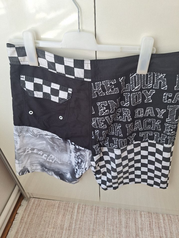 Siyah renk, bol kesim ve mini boy erkek deniz şortu. Baskılı desenler, tokalı detaylar ve sokak stili rock punk havası taşır. Plaj için uygun beden L