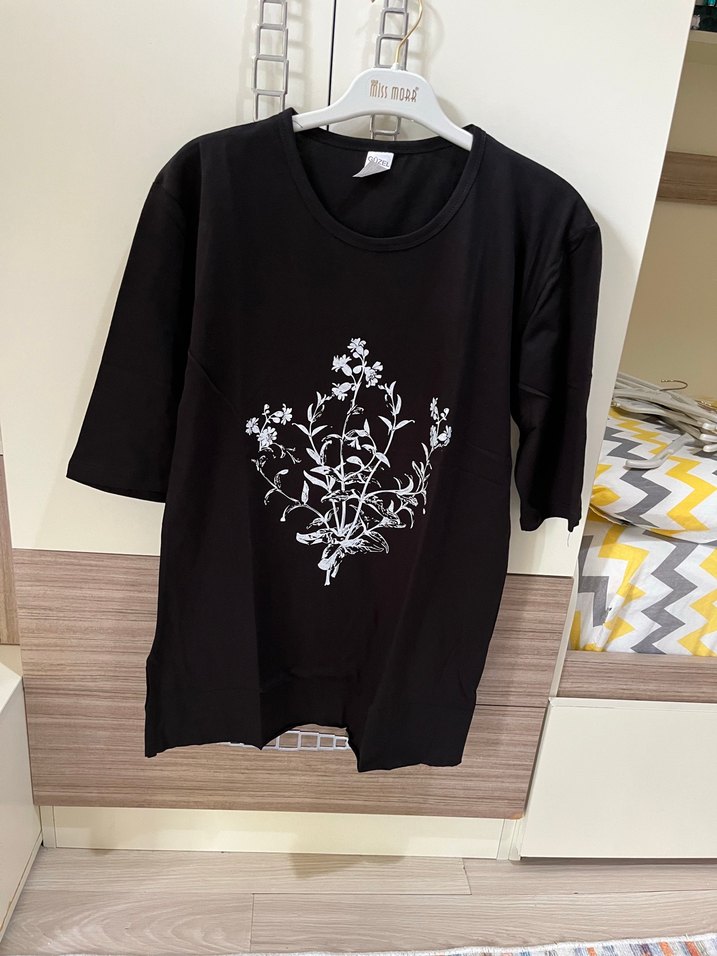 Siyah, pamuklu, mini uzunlukta, rahat kesim kadın tişörtü. Önünde beyaz çiçek baskısı, kısa kollu ve yuvarlak yaka.