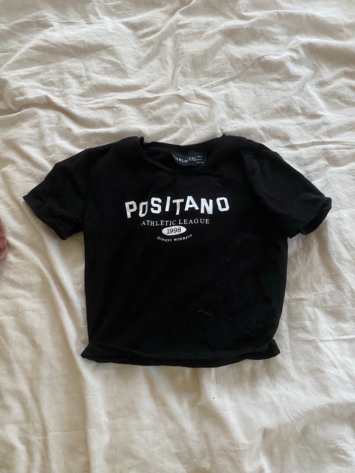 Pamuk kumaştan, kısa kollu, bol kesim ve bisiklet yaka siyah tişört. Üzerinde "Positano Athletic League" baskısı bulunur. Rahat ve sportif tarzda.