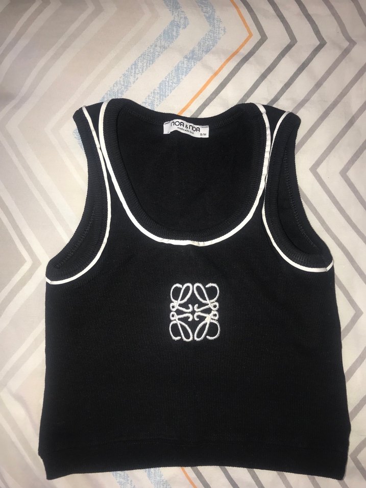 Siyah, baskılı ve beyaz detaylı, sentetik kumaştan mini kısa kesim, kolysuz ve dar kesim sporcu üstü.