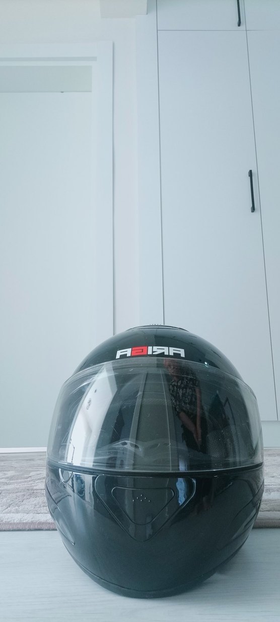 Siyah i baskılı motosiklet kaskı, şeffaf vizör ve Velcro kapama içerir. Dayanıklı plastikten yapılmış, minimalist tasarıma sahiptir. ️