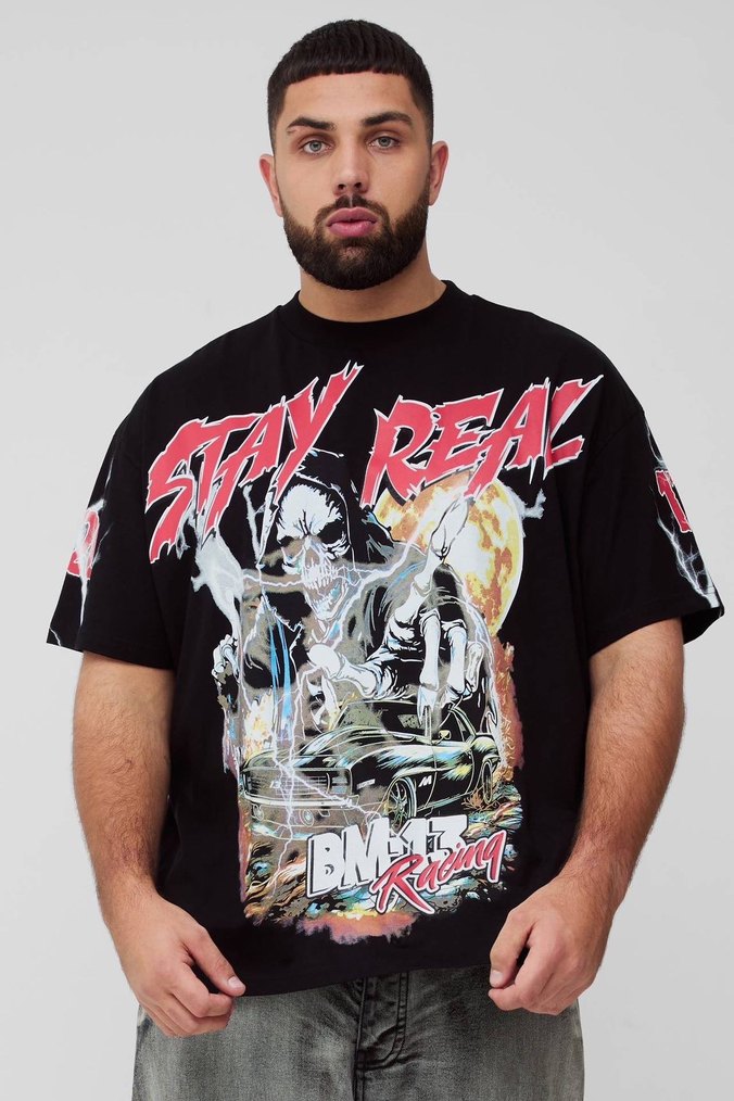 BoohooMAN marka Siyah renkte, baskılı grafiklere sahip, sentetik kumaştan yapılmış, kısa kollu, oversize erkek tişörtü. Grunge punk tarzında ve spor için uygundur.