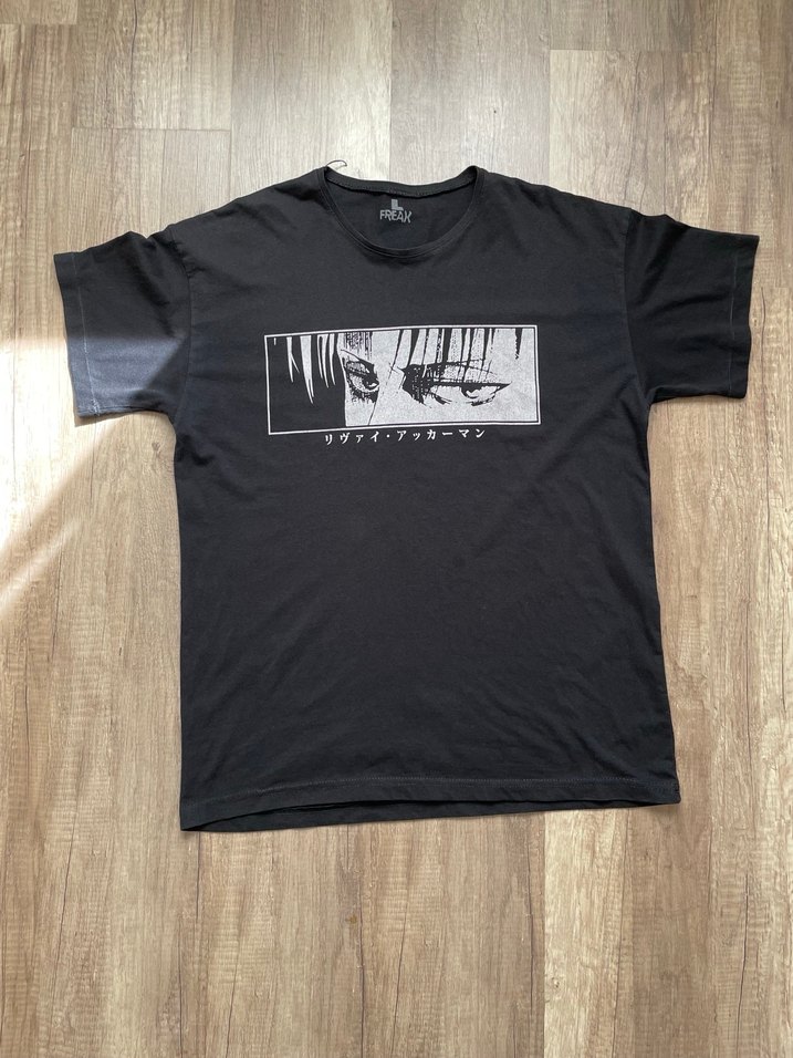 Pamuk siyah oversize erkek tişört, kısa kollu ve göğüste baskılı anime tarzı grafik. Yuvarlak yakalı, streetwear stilinde.