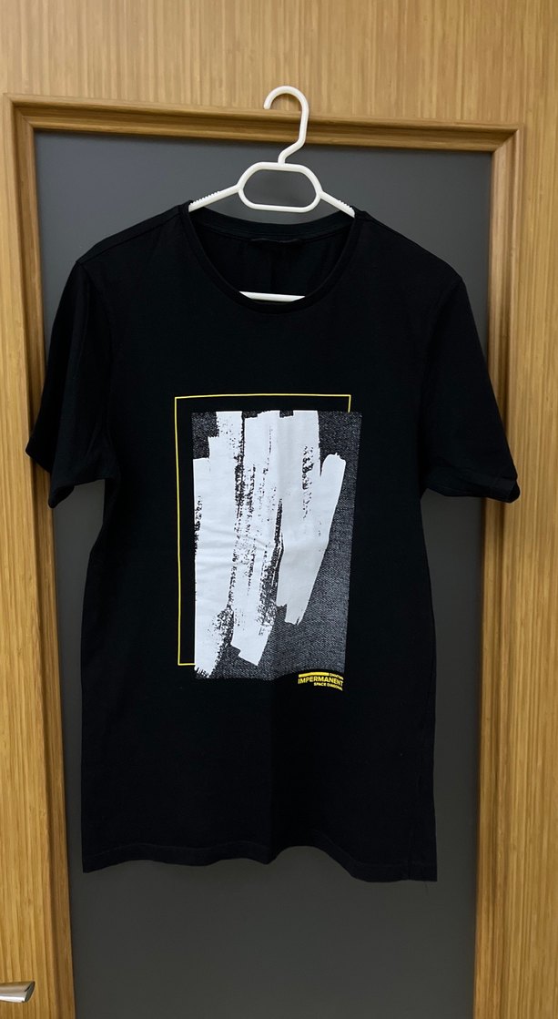 Siyah, oversize kesim erkek tişört, kısa kollu ve önünde soyut baskı deseni bulunur. Yumuşak sentetik kumaştan, yuvarlak yakalı, günlük kullanım için uygundur.