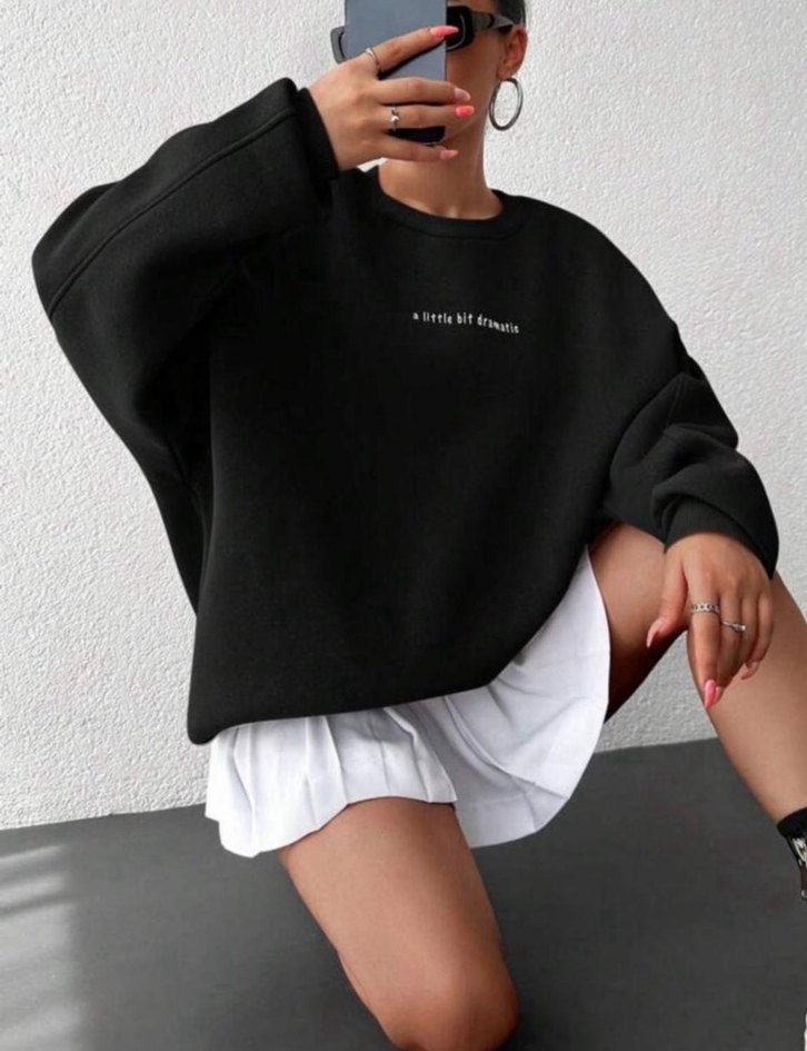 Pamuk kumaştan yapılmış, siyah baskılı, uzun kollu ve oversize kesim kadın sweatshirt. Günlük kullanıma uygun rahat ve şık bir sokak stili ürünü.