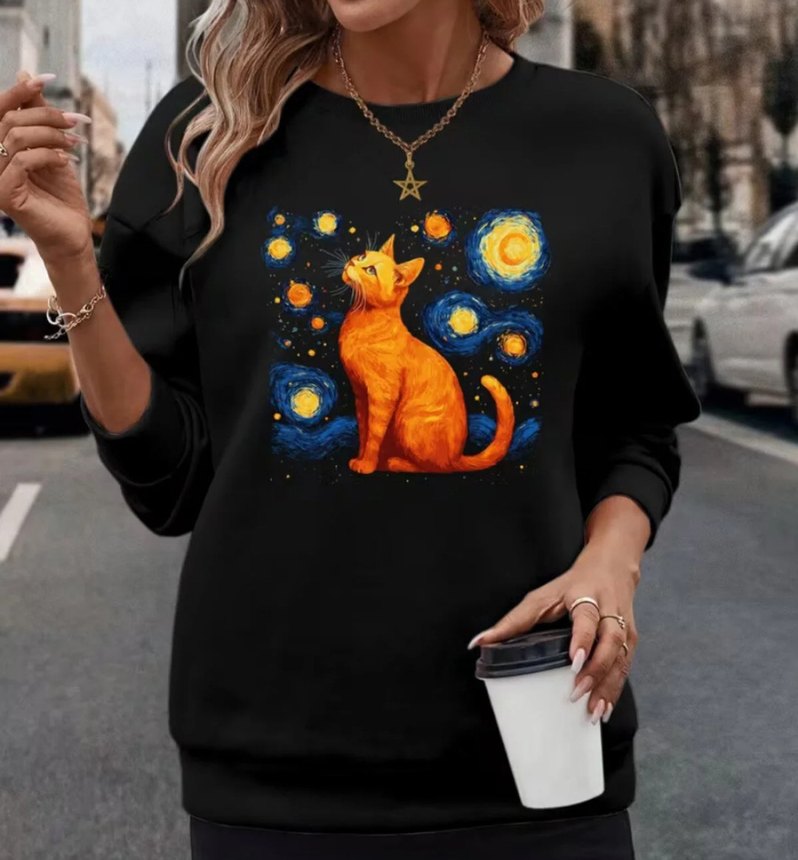 Siyah, oversize,uzun kollu, rahat kesim sweatshirt. Üzerinde turuncu kedi ve yıldızlı gece baskısı bulunur. Yumuşak ve sıcak kumaştan, yuvarlak yaka ile rahat kullanım için uygun. S - M - L - XL - 2XL