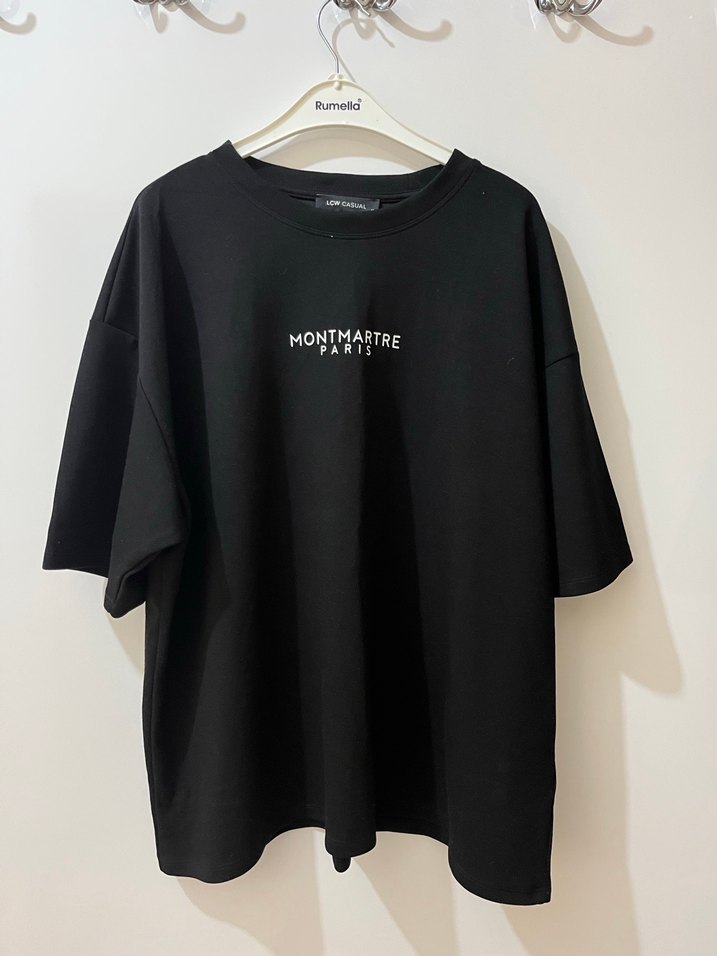 Siyah, kısa kollu, yuvarlak yakalı ve baskılı 'MONTMARTRE' yazılı oversize kadın tişörtü. Yumuşak sentetik kumaştan, rahat athleisure tarzında.