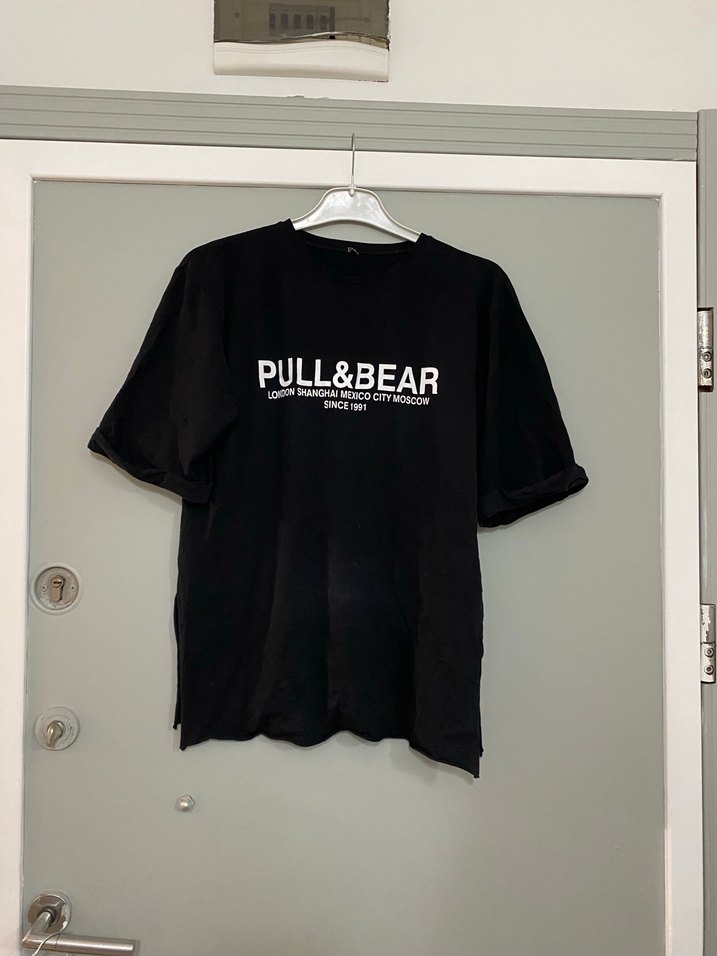 Yumuşak ve sıcak kumaştan, baskılı PULL&BEAR logosu bulunan siyah, kısa kollu, oversize kadın tişörtü. Günlük kullanıma uygun.