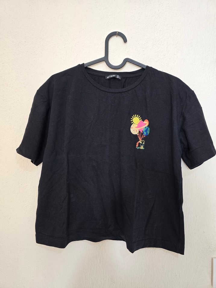 Pamuklu, siyah renk, yuvarlak yaka ve kısa kollu, göğüs kısmında renkli baskı bulunan bol kesim tişört. Rahat ve günlük stil için uygun.