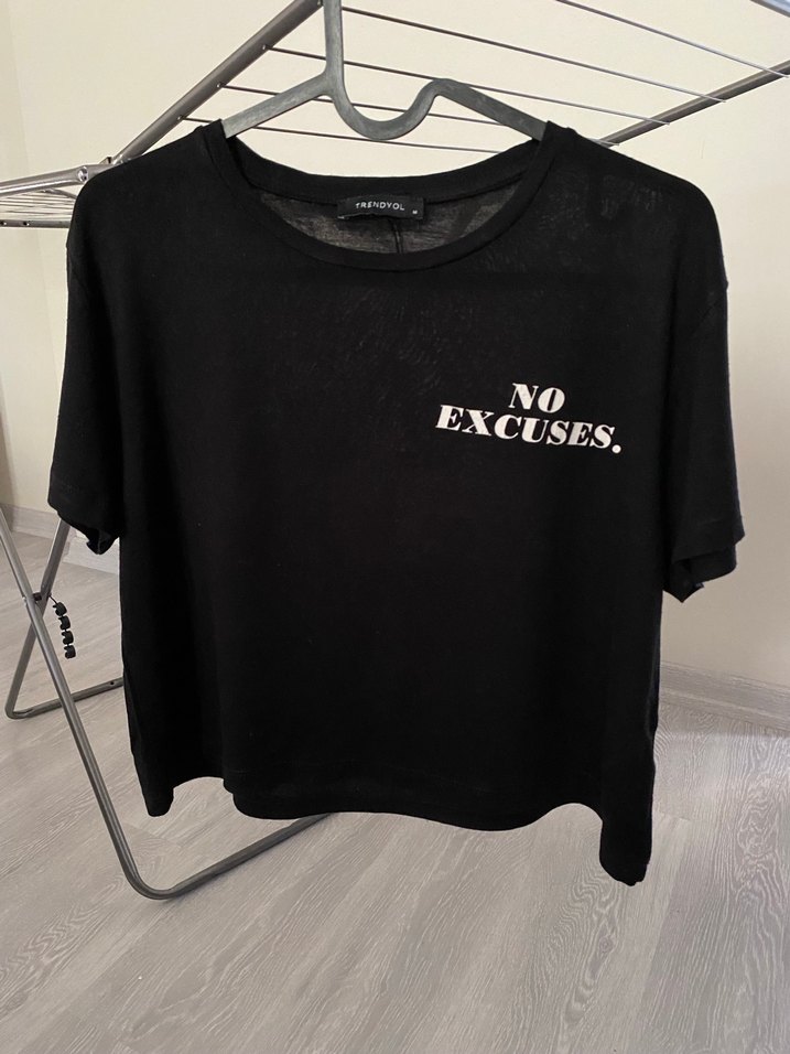 Siyah renkli, kısa kollu, oversize kesim kadın tişörtü. Önünde "NO EXCUSES." baskısı bulunur. Günlük sokak stili için uygundur. Yumuşacık, kalıbı güzeldir.