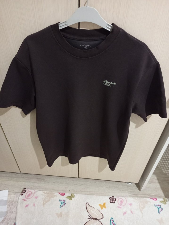 Oversize kesim, kısa kollu, yuvarlak yaka siyah kadın tişörtü. Küçük baskı detayı ve yumuşak, sıcak dokusu ile rahat bir stil sunar.